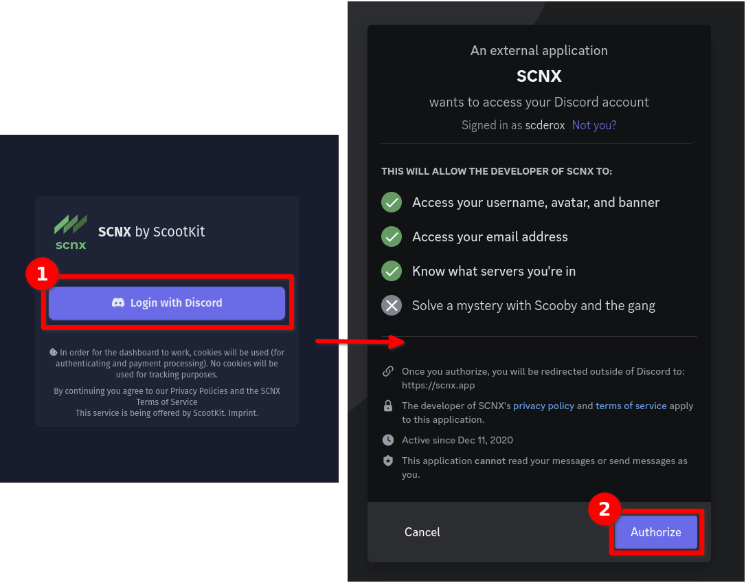 Gehe auf scnx.app, um zu beginnen. Dort wirst du gebeten, dich mit deinem Discord-Account anzumelden. Klicke dafür einfach auf den "Mit Discord anmelden" Knopf. Wenn du dich fragst, warum wir Zugriff auf bestimmte Bereiche deiner Informationen brauchen ("scopes"), findest du die Antworten in unserem FAQ.