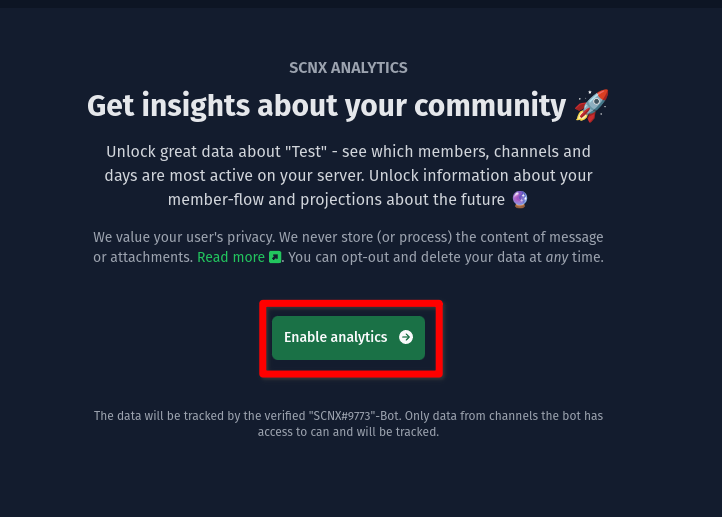 To enable analytics, visit the analytics page of your Discord on SCNX and click on "Enable analytics".