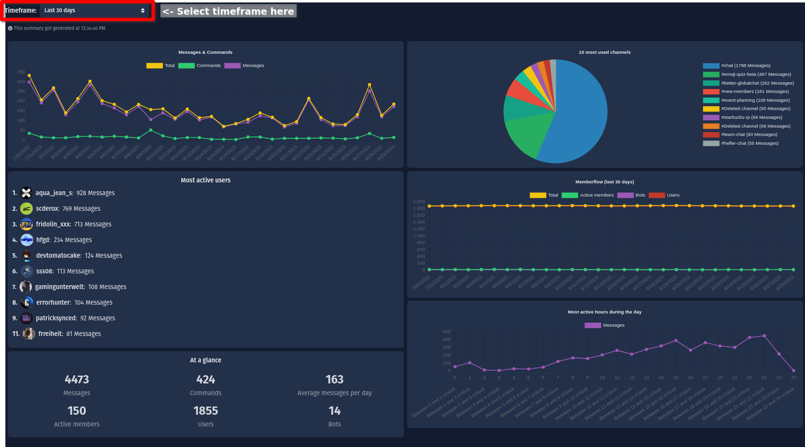 - Messages & Commands: You'll see a graph showing how many messages and commands have been sent on each day in the timeframe.